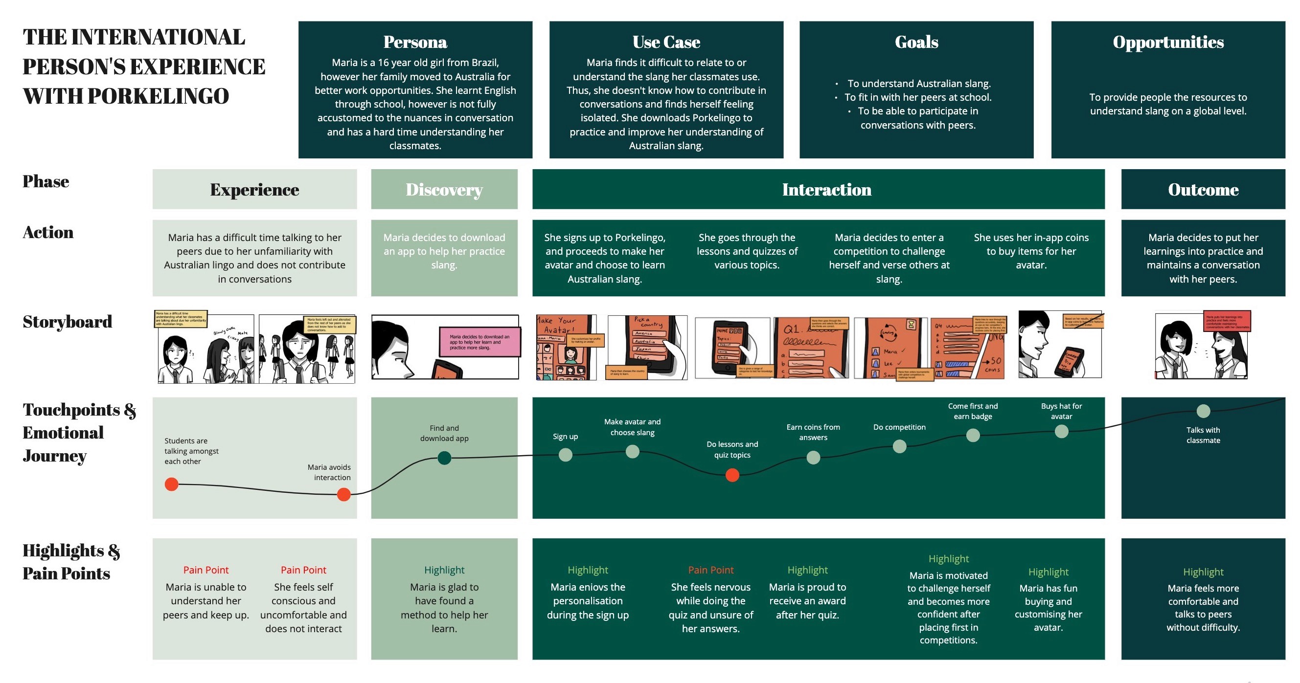I owned the end-to-end product development process from defining the problem space through to a validated prototype. Rather than starting with screens, I anchored the process in research: we needed to understand not just what international users struggled with, but why existing solutions weren't working for them and what would need to be true for a new product to stick. We ran 12 user interviews and 2 survey rounds with international students and recent expats in Australia. I synthesised findings into personas and empathy maps that the team used as a shared decision-making reference throughout the project. Two insights directly shaped the product strategy: First, users didn't struggle with finding slang; they struggled with knowing when and how to use it appropriately, which Duolingo-style flash cards couldn't solve. Second, motivation collapsed when there was no social element; users wanted to compete with people, not learn alone. These findings led directly to the core product pillars: contextual learning (not definitions), social competition, and a visible progression system. Product Strategy & Information Architecture Using the research insights, I led the team in mapping end-to-end user journeys across four key flows: onboarding, daily learning sessions, quiz mode, and social competitions. The IA work revealed a critical sequencing problem; early concepts put competitive features too early, before users had enough confidence to engage socially. We restructured the onboarding progression to gate social features behind initial learning milestones, reducing the risk of new users feeling exposed before they were ready. This decision shaped the entire feature prioritisation going forward. Using these insights, we created user flows and journey maps to define onboarding, lesson progression, and social features. Paper prototypes and low-fidelity wireframes were used to validate navigation patterns and gamification logic. Moving into high-fidelity design, we focused on visual hierarchy and feedback loops to guide users through tutorials, quizzes, and competitions. Prototyping & Early Validation Before investing in high-fidelity design, I prioritised low-fidelity testing to pressure-test our navigation assumptions and gamification logic. Paper prototypes revealed two early problems: users expected a home dashboard (we had designed a direct-to-lesson entry), and the reward mechanics weren't visible enough at the point of completion. Both were addressed before moving into high-fidelity design, avoiding significant rework. Iteration & Usability Testing We ran four structured rounds of usability testing across 53 participants, using think-aloud sessions, task observation, and heuristic evaluation. Each round had a defined focus area: Round 1 tested core navigation and onboarding flow; Round 2 focused on gamification clarity and reward comprehension; Rounds 3 and 4 validated iteration quality and measured improvement against Round 1 baselines. Key changes driven by testing included: simplifying the onboarding, redesigning the badge system after users couldn't identify what they'd earned or why, restructuring the quiz flow after users repeatedly expected a review screen before submitting answers and a complete UI redesign following feedback regarding the trustworthiness of the app. The final prototype comprised 200+ screens with embedded micro-interactions and progression mechanics refined across all four rounds.
