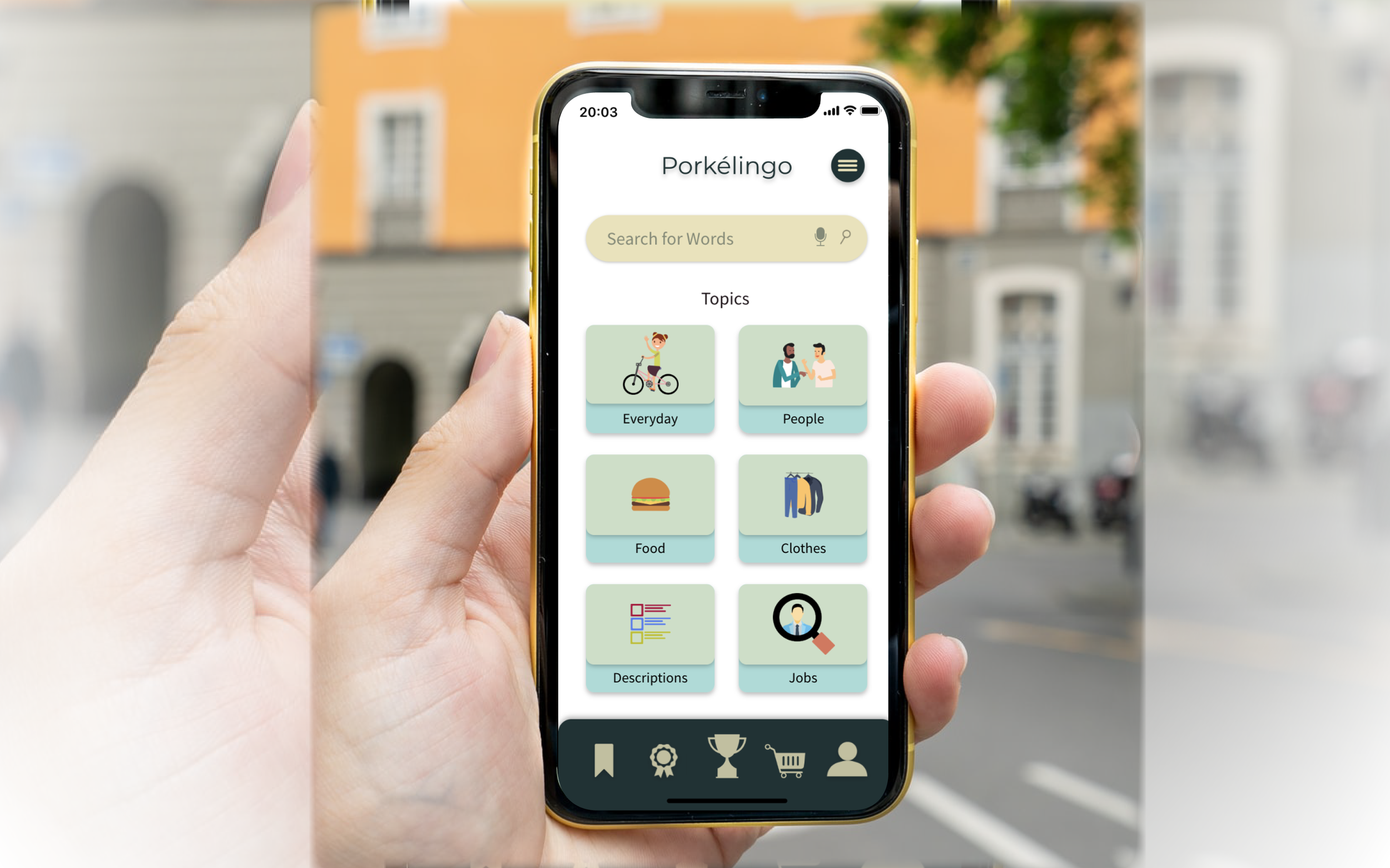 Our Slang App, is called Porkélingo which allows you to learn slang. Its main feature is the topics, where it's split into two, a tutorial and then a quiz, it helps keep your progress in check. You can also be in competitions with other people around the world or your friends to verse them in the slang. The quizzes and competitions help you earn badges and coins which can be used to buy things for your Avatar, for example clothes or power ups to help you in the competitions.